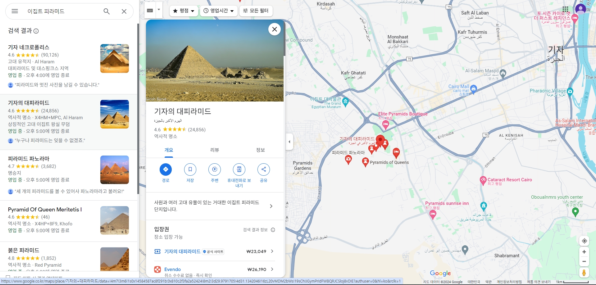 구글지도에서는 유명한 관광지나 랜드마크도 검색할 수 있습니다. 예를 들어 피라미드나 스핑크스와 같은 유명한 장소를 검색하면, 관련 사진과 지도 정보가 함께 나타납니다. 이 기능은 특정지역의 주요 관광지나 랜드마크를 미리 확인하는 데 유용합니다.