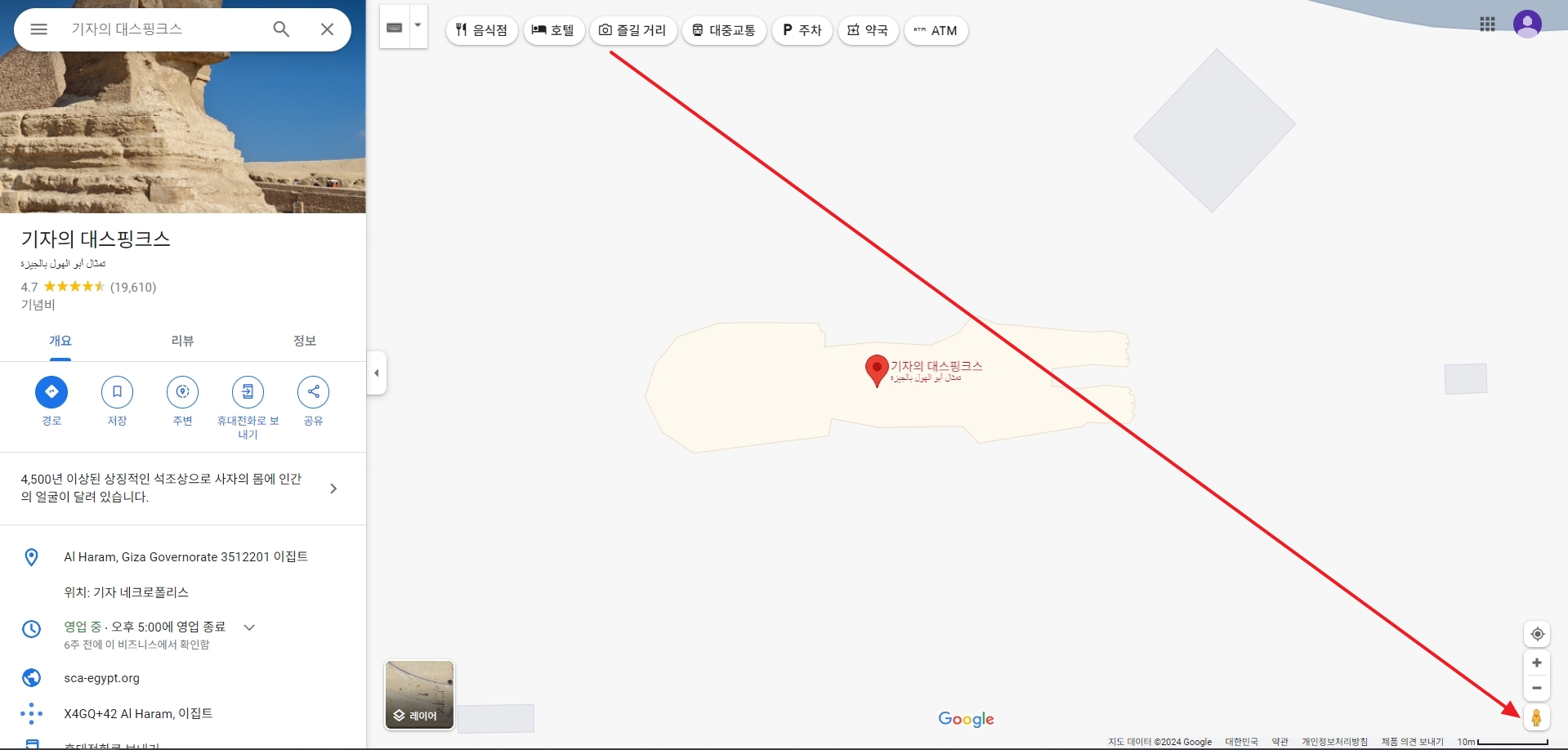 스핑크스를 검색하여 지도를 확대한 후 우측 하단에 있는 사람 모양 버튼을 클릭합니다. 이 버튼은 구글지도의 스트리트뷰 기능을 활성화하는 버튼으로, 실제 현장의 모습을 가상으로 체험할 수 있게 해줍니다.
