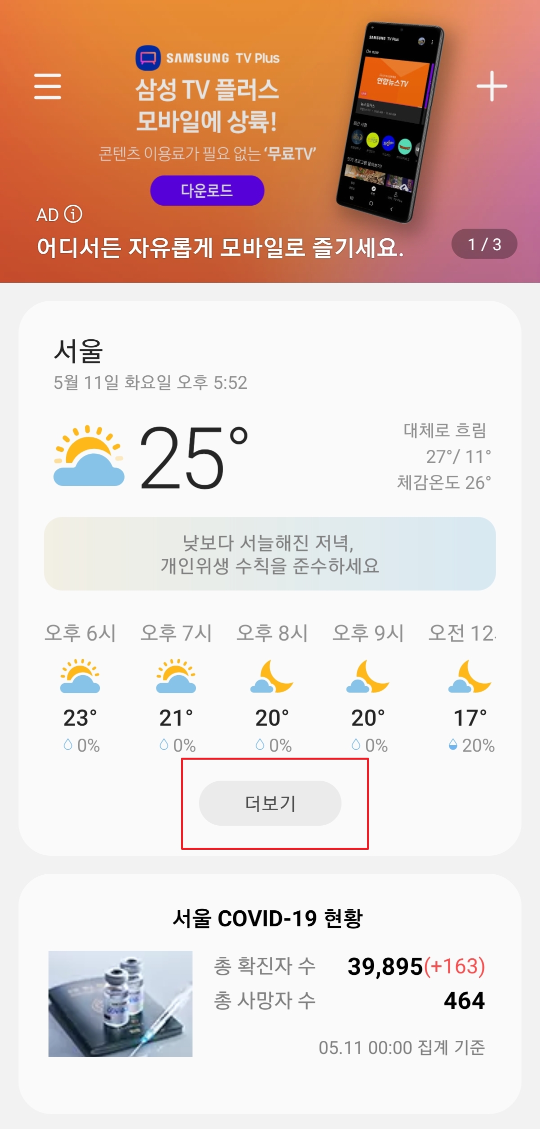 참고로 갤럭시 날씨 정보는 '웨더뉴스(Weather News)' 데이터를 기반으로 제공돼요. 예전에는 케이웨더였던 것 같은데 업데이트되면서 바뀌었더라고요. 더 자세한 정보가 궁금할 땐 하단에 '더보기'를 누르면 웹사이트로 연결돼서 위성 영상 같은 것도 볼 수 있습니다.