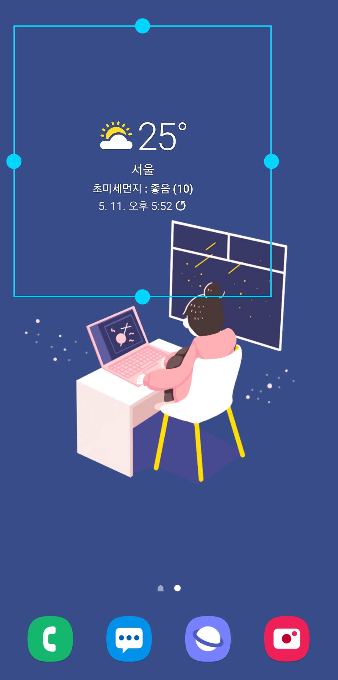 위치 설정을 마치고 위젯을 배치했는데 크기가 마음에 안 드신다고요? 걱정하지 마세요. 배치된 위젯을 1초 정도 꾹 누르고 있으면 테두리에 파란색 조절바가 생기거든요. 이걸 드래그해서 내 맘대로 크기를 늘렸다 줄였다 할 수 있습니다.