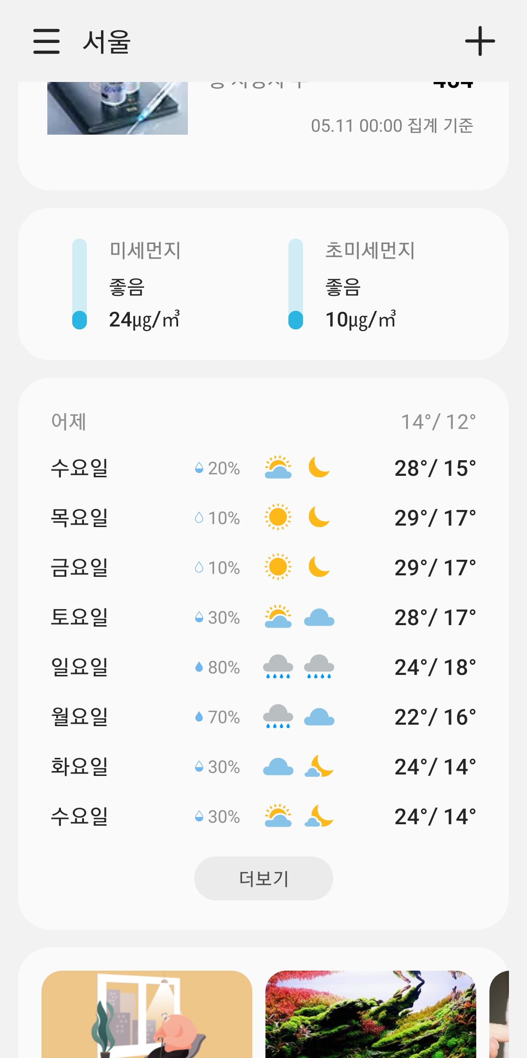 앱 내부로 들어가면 이렇게 시간별 날씨, 주간 예보, 그리고 미세먼지 수치까지 아주 상세하게 나옵니다. 갤럭시 기본 날씨는 인터페이스가 직관적이라 어르신들도 보기 편하다는 장점이 있어요. 스크롤을 내리면 습도, 바람, 자외선 지수 같은 생활 지수도 다 볼 수 있답니다.