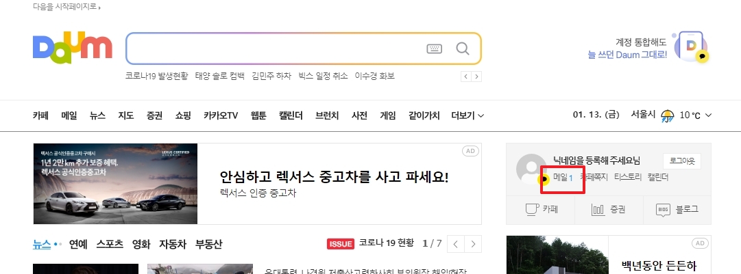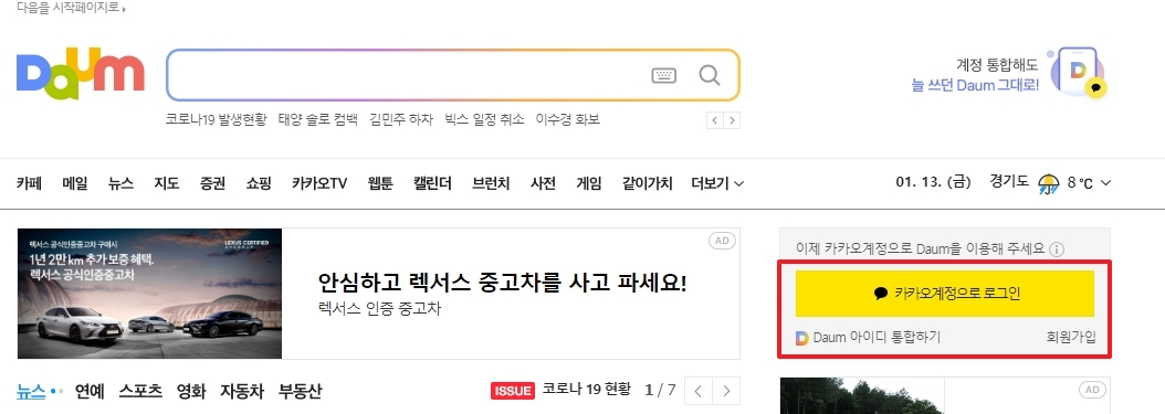 다음 홈페이지에 접속하면 우측 화면에 로그인 관련 메뉴들이 보이실 텐데요. 예전처럼 단순히 아이디만 입력해서 들어가는 게 아니라, 이제는 카카오 계정 기반으로 운영되고 있어요. 만약 아직 통합을 안 하셨다면 로그인 버튼 바로 아래에 있는 통합하기 메뉴를 통해 진행해 주셔야 합니다.