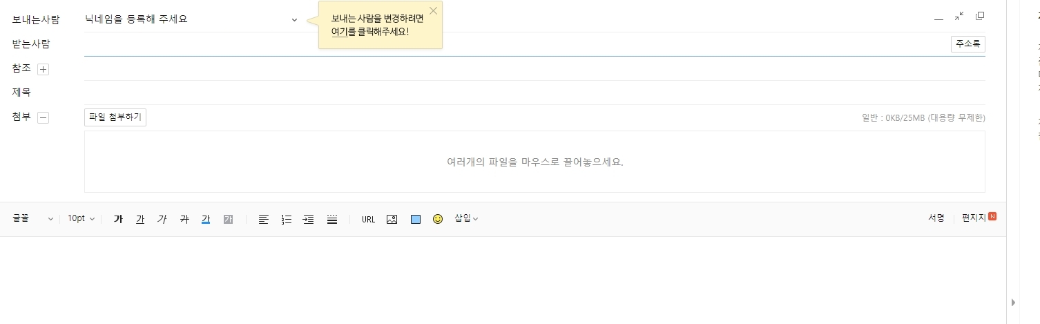 메일 쓰기 기능도 한번 살펴볼까요? 작성 버튼을 누르면 익숙한 편집 창이 뜨는데, 여기서 보내는 사람의 닉네임을 자유롭게 변경할 수 있습니다. 실명을 쓰기 꺼려지는 상황에서는 닉네임을 활용해 보세요.