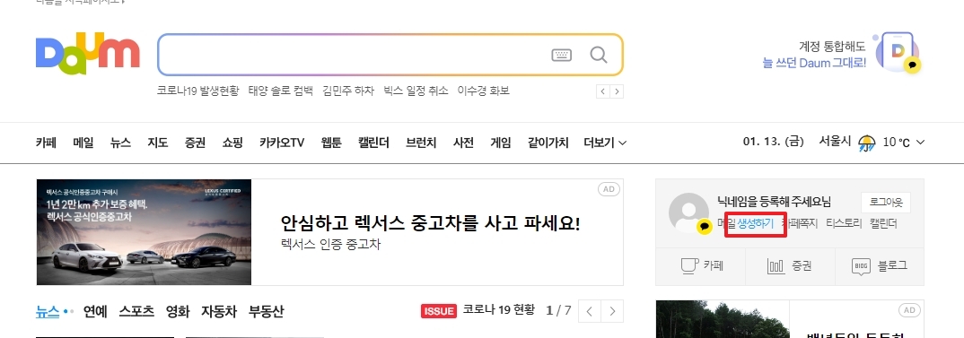 로그인 후에 메일 아이콘을 눌렀을 때, 기존에 메일을 쓰던 분들은 바로 수신함이 보일 거예요. 하지만 만약 다음 메일이 없는 상태였다면 '생성하기' 버튼이 보일 텐데요. 여기서 간단하게 새로 만드실 수 있습니다.