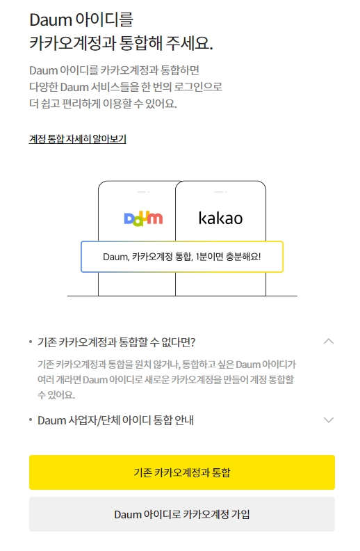 어떤 방법을 선택하든 기존 다음 정보와 카카오 정보를 하나로 묶는 과정이라고 이해하시면 됩니다. 본인이 관리하기 편한 쪽으로 선택해서 진행해 주세요.