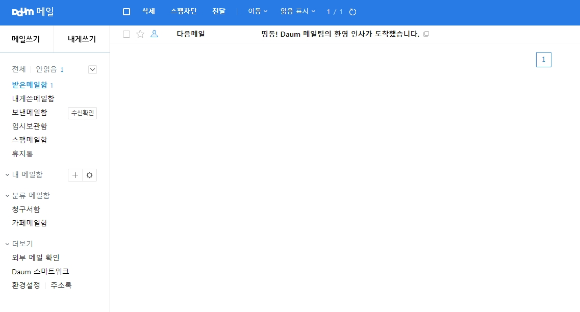 수신함에 들어가 보면 신규 가입 축하 메일이 와 있는 걸 확인할 수 있습니다. 기본적으로 다음 메일 인터페이스는 깔끔하고 가독성이 좋아서 오래 사용하신 분들이 특히 떠나지 못하고 계속 쓰시더라고요.