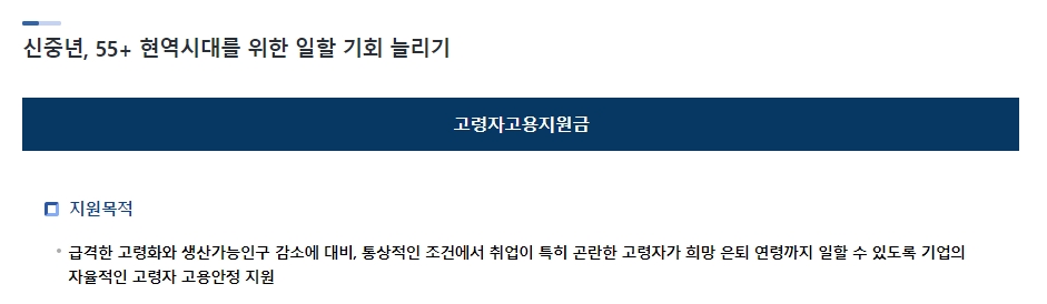 고용안정 섹션에서 고령자 고용지원금을 찾아 클릭합니다. 이 부분에서는 60세 이상 고령자를 대상으로 하는 고용지원금에 대한 구체적인 정보를 제공합니다.