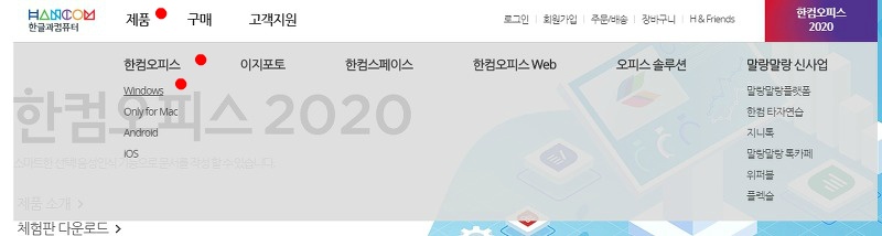 결국 가장 합리적인 선택은 최신 버전 체험판을 이용하는 건데요. 사이트 상단 메뉴에서 [제품] - [한컴오피스]로 들어가신 다음, 본인의 운영체제에 맞는 Windows 버전을 선택해 주시면 됩니다. 맥 쓰시는 분들은 맥용을 따로 고르셔야 해요.