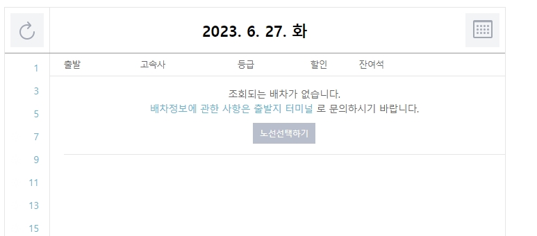 등급은 특별히 가리는 게 없다면 '전체'로 두시는 게 좋습니다. 우등이나 프리미엄만 골라 타실 게 아니라면 전체 조회가 배차 시간을 확인하기에 훨씬 유리하거든요.