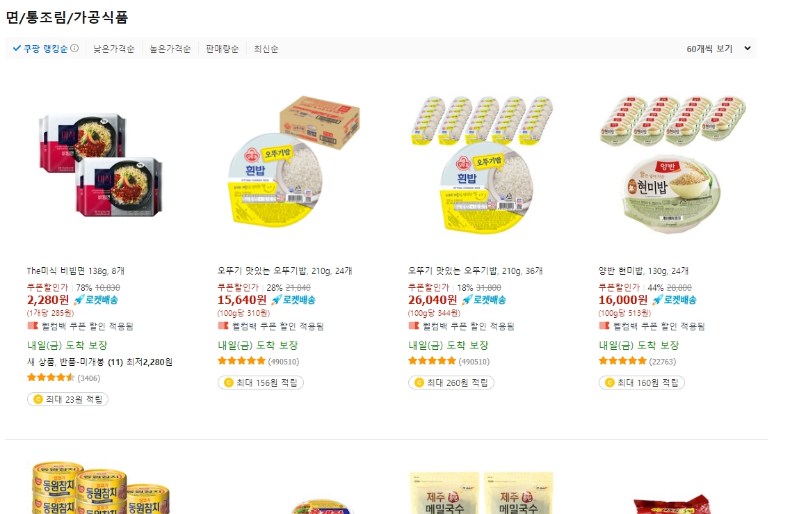 이게 은근히 직관적인데 모르고 지나치시는 분들이 많아요. 여기서 바로 클릭하고 들어가면 다른 생활용품이랑 섞이지 않고 오직 먹거리만 모아서 볼 수 있어서 장보기가 훨씬 수월해져요.