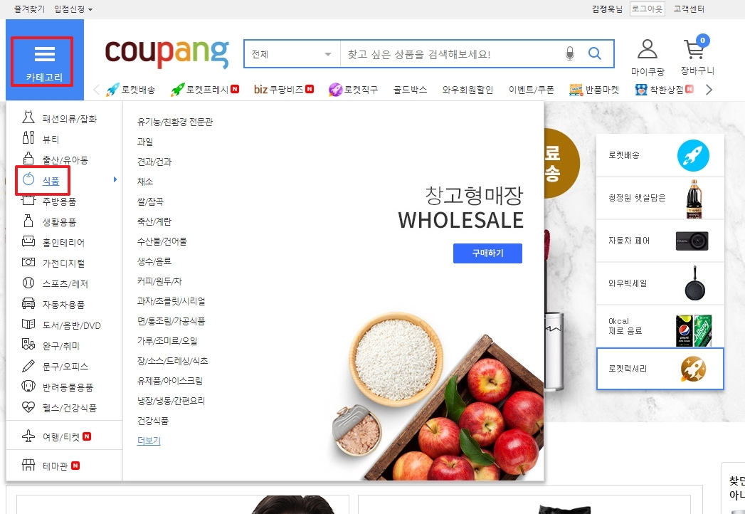 좌측 상단에 파란색 줄 세 개가 그려진 '카테고리' 버튼에 마우스를 살짝 올려보세요. 클릭하지 않고 올리기만 해도 하단으로 전체 메뉴가 쭉 펼쳐지거든요. 여기서 중간쯤 보시면 식품이라는 글자가 딱 보이실 거예요.