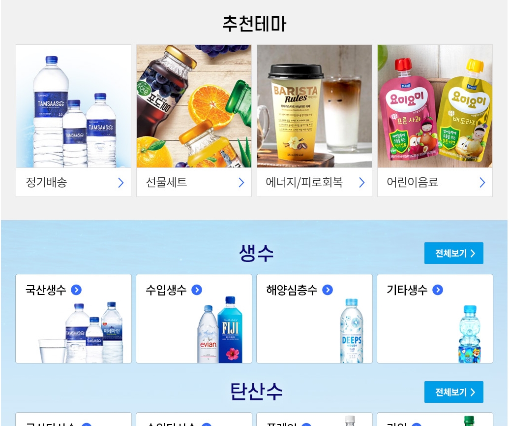 생수 코너도 제가 자주 들르는 곳 중 하나예요. 물은 무게 때문에 오프라인에서 사기 진짜 힘들잖아요. 정기 배송을 설정해두면 떨어질 때쯤 알아서 오니까 신경 쓸 필요가 없어 정말 편하더라고요.