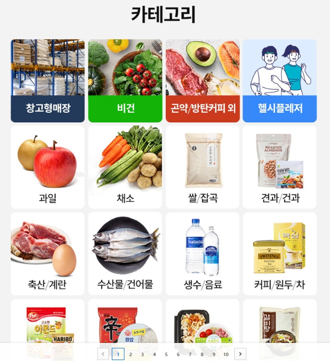 글씨만 보면 눈 아프다 하시는 분들을 위해 상단에는 이렇게 그림 아이콘으로도 정리가 잘 되어 있어요. 창고형 매장이나 비건, 곤약, 헬스 같은 인기 키워드들은 따로 모아져 있어서 트렌디한 식재료 찾기에 딱이더라고요.