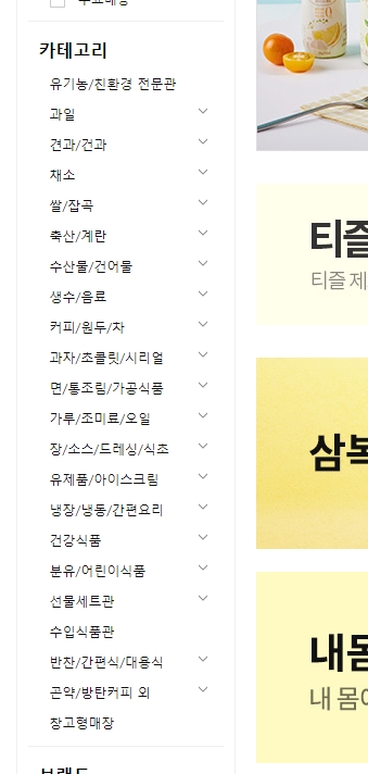 좌측 상단에 파란색 줄 세 개가 그려진 '카테고리' 버튼에 마우스를 살짝 올려보세요. 클릭하지 않고 올리기만 해도 하단으로 전체 메뉴가 쭉 펼쳐지거든요. 여기서 중간쯤 보시면 식품이라는 글자가 딱 보이실 거예요.