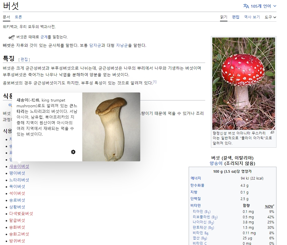여기서 정말 유용한 팁을 하나 드릴게요. 궁금한 버섯 이름이 보인다고 무조건 클릭해서 페이지를 이동할 필요가 없습니다. 저도 예전엔 일일이 다 눌러봤는데, 마우스 커서만 살짝 올려도 미리 보기 팝업이 뜨거든요.