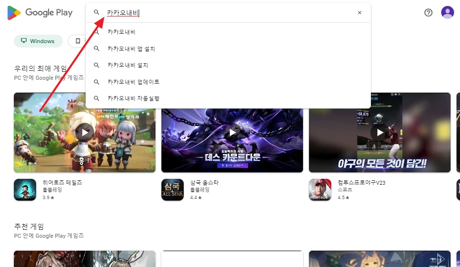 플레이스토어 검색창에 카카오 내비를 입력하는 화면