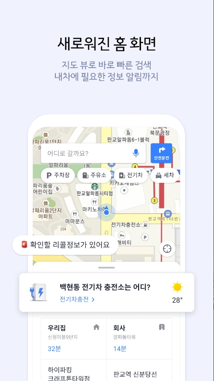 • 추천 경로: 실시간 교통정보를 반영한 최적의 길