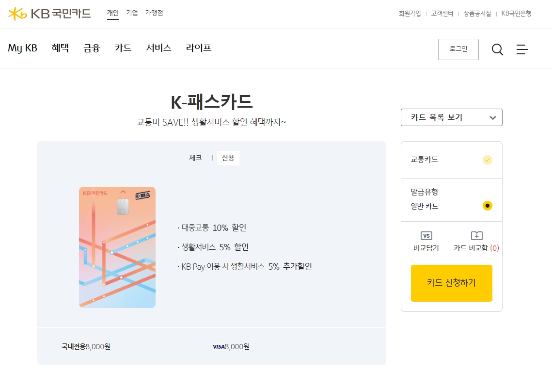 예를 들어 국민카드를 한번 클릭해봤는데요, 연회비 8천 원에 대중교통 10% 청구 할인이 들어있네요. 만약 K패스 기본 환급금에 이 카드사 할인까지 중복으로 적용된다면 교통비 절감 효과가 엄청날 것 같습니다.