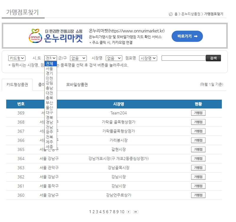 검색 필터가 꽤 상세하게 되어 있어요. 상품권 종류(지류/모바일/카드)를 먼저 선택하고, 시/도 및 군/구 지역을 설정하면 해당 지역의 시장 리스트가 쫙 나옵니다. 여기서 내가 가진 상품권 종류를 취급하는지 미리 필터링할 수 있다는 게 핵심이에요.
