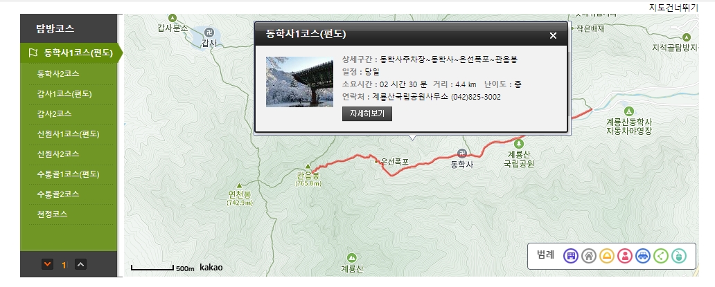 이 코스는 동학사 주차장에서 시작해 관음봉을 찍고 내려오는 루트인데요. 계룡산의 진면목을 볼 수 있는 알짜배기 코스라고 할 수 있죠. 은선폭포 같은 명소도 지나가기 때문에 사진 찍으면서 쉬엄쉬엄 올라가기에 안성맞춤입니다.