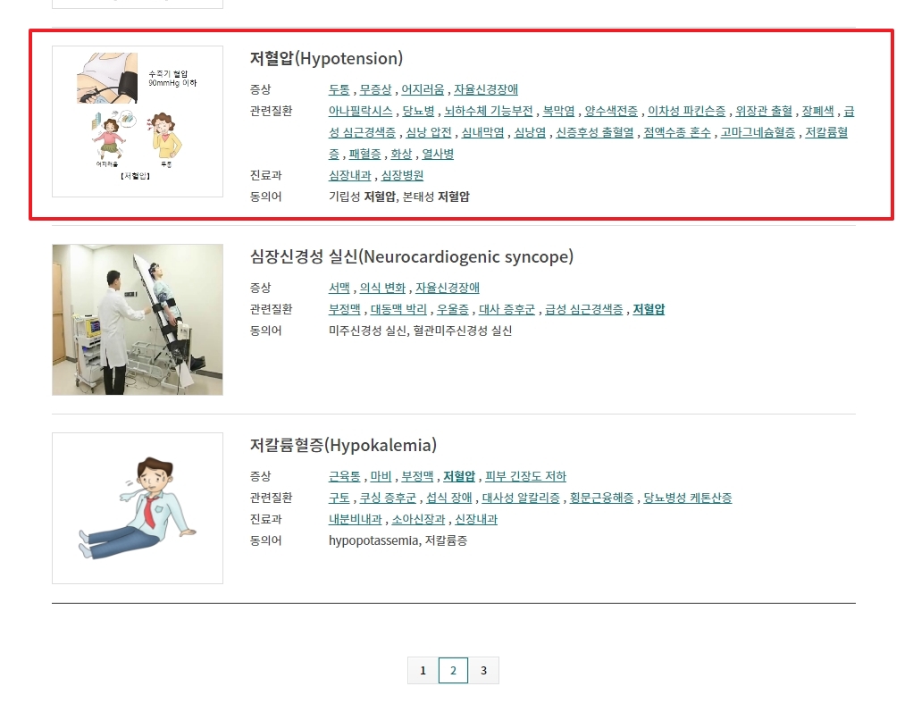 상세 페이지로 들어가 보면 수치에 대한 정의가 딱 나와 있는데요, 앞서 말씀드린 90/60mmHg 기준이 절대적인 건 아니에요. 사람마다 타고난 혈압이 다르기 때문에 이 수치보다 조금 낮아도 별다른 증상이 없다면 치료가 필요 없는 경우도 많거든요.