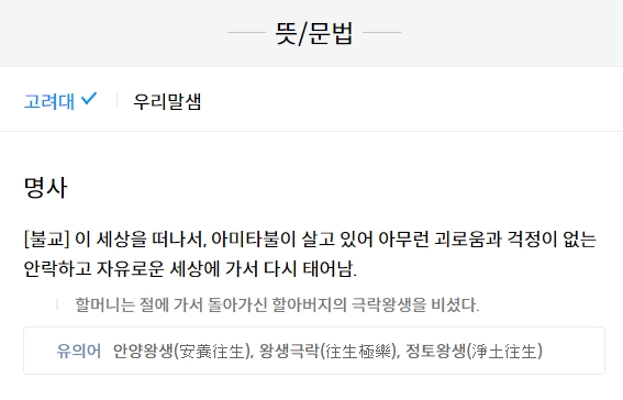 결과를 자세히 보시면 '아미타불의 국토에 다시 태어난다'는 설명이 보이실 거예요. 여기서 정말 중요한 포인트는 '왕생'이라는 단어인데요. 그냥 죽어서 끝나는 게 아니라 가서(往) 태어난다(生)는 윤회의 개념이 포함되어 있다는 게 핵심입니다. 끝이 아니라 새로운 시작이라는 관점이죠.