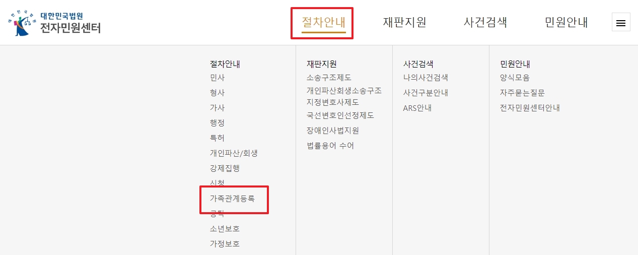 - 상단 메뉴: 절차안내 > 가족관계등록