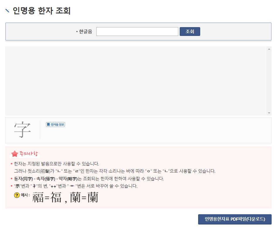 개인적으로는 PDF보다 사이트 검색 기능을 이용하는 게 훨씬 효율적이라고 생각합니다. 좋은 이름 지으시길 바라며, 꼭 법적으로 문제없는 글자인지 먼저 체크해 보시길 추천해 드려요.