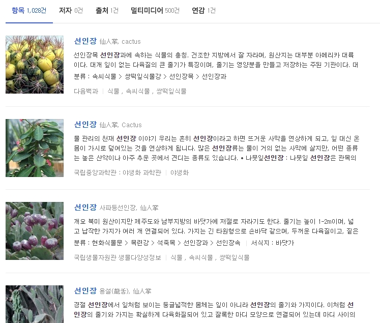 홈페이지의 검색 창에 선인장이라는 키워드를 입력하십시오. 이를 통해 선인장에 관한 기본 정보 및 관련 내용들을 볼 수 있습니다.