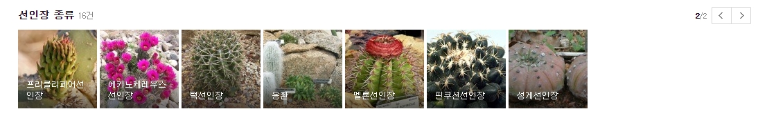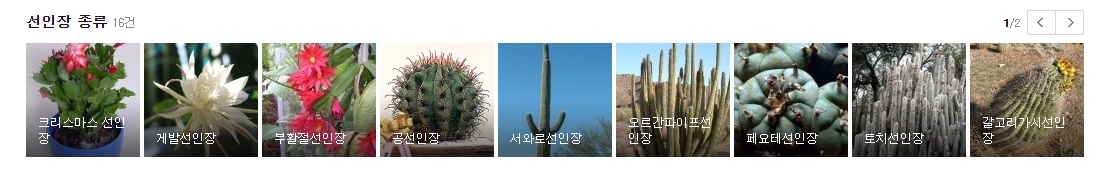 검색 결과 최상단에 종류가 나오는데, 상세한 선인장의 종류와 그에 대한 설명이 제공됩니다. 상단에는 총 16건의 선인장 종류가 나타나지만, 이 중에서도 집에서 직접 기르기 어려운 종류들이 포함되어 있습니다.