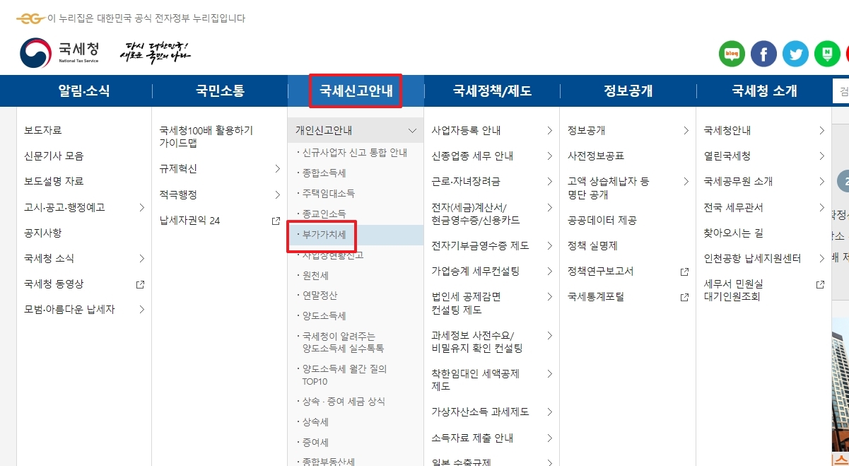 국세청 홈페이지를 방문하여 정보를 찾습니다. 해당 홈페이지에서는 국세 관련 모든 정보가 있으며 부가가치세 또한 찾아볼 수 있습니다.