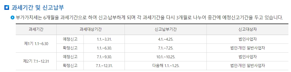 확정신고에 대해서는 제2기 과세기간인 7월 1일부터 12월 31일까지의 부가가치세를 다음해 1월 1일부터 1월 25일까지 신고납부해야 하며, 이는 법인사업자뿐 아니라 개인 일반사업자 모두에게 해당됩니다.