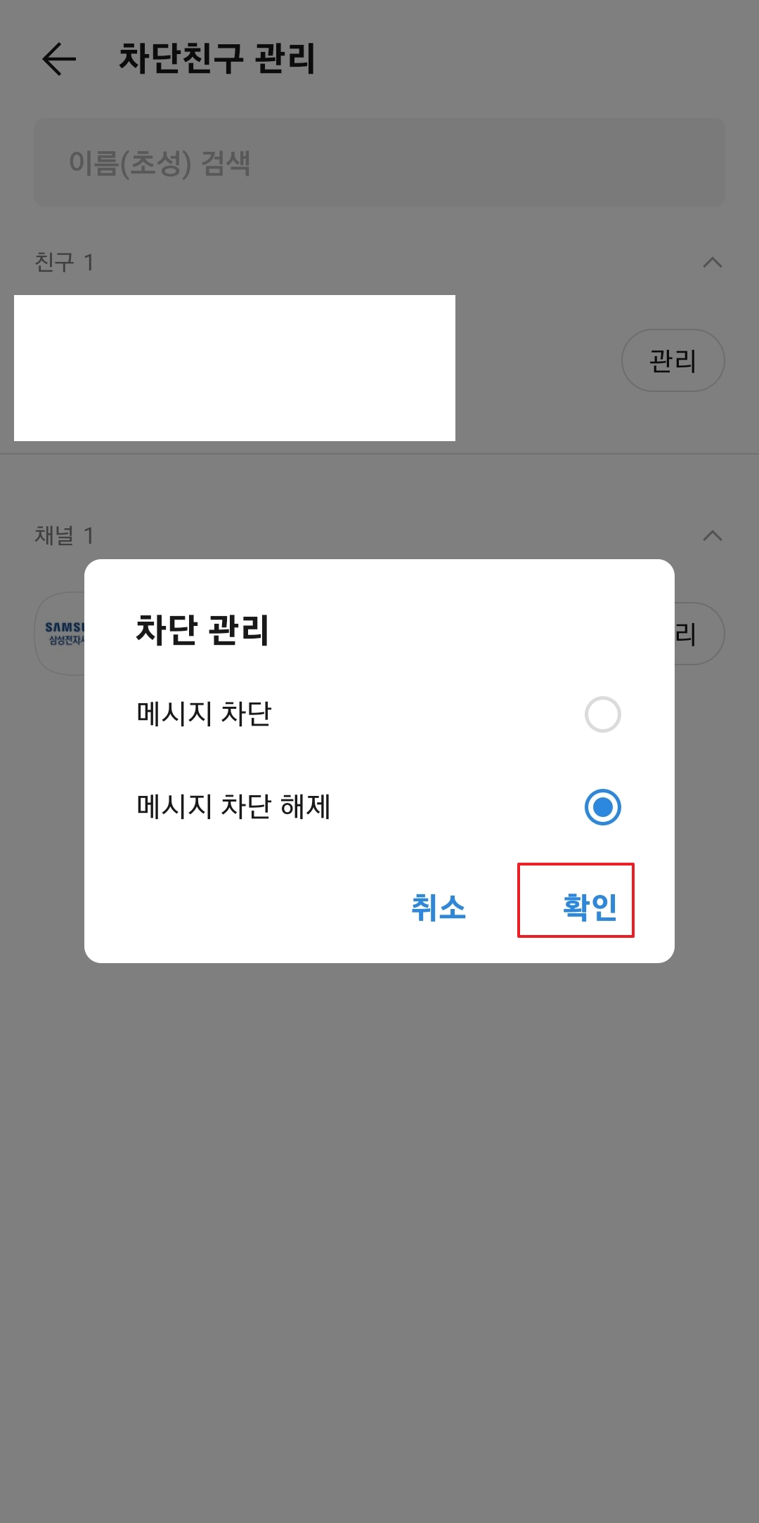 목록에서 삭제하려는 채널 이름 옆에 있는 '관리' 버튼을 눌러주세요. 그러면 메시지 차단만 할 것인지, 프로필까지 비공개할 것인지, 아니면 차단을 해제할 것인지 묻는 창이 나옵니다.