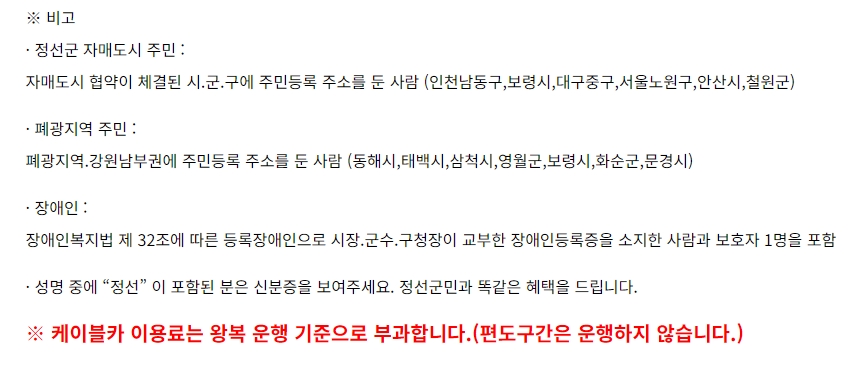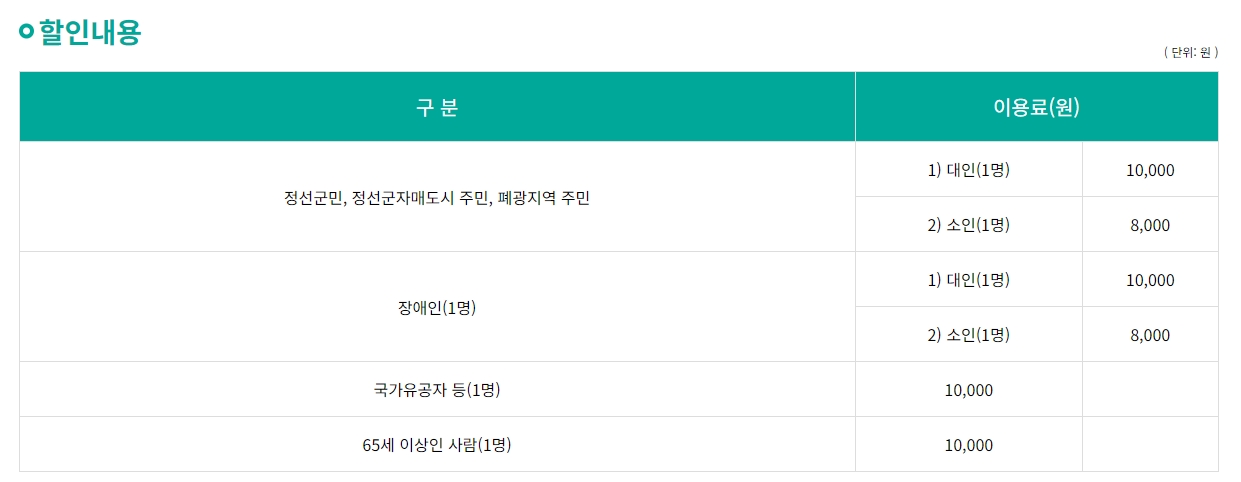 할인 혜택도 꽤 다양하게 준비되어 있는데요, 정선군민뿐만 아니라 폐광지역(태백, 삼척, 영월 등) 주민이나 자매도시 거주자도 할인을 받을 수 있어요. 할인 대상에 해당되면 대인 10,000원, 소인 8,000원으로 꽤 많이 저렴해집니다.