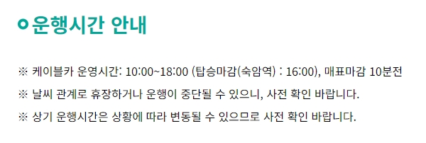 운행 시간은 오전 10시부터 오후 6시까지로 되어 있지만, 가장 주의하셔야 할 점은 바로 탑승 마감 시간이에요. 숙암역 기준으로 오후 4시에 탑승이 마감되기 때문에 늦어도 3시 반까지는 도착하셔야 여유롭게 티켓을 끊고 올라갈 수 있습니다.