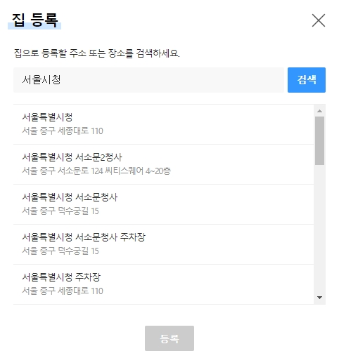 검색 결과 목록 중에서 우리 집 주소가 맞는지 꼼꼼히 확인하고 선택해 주세요. 저는 예시로 시청을 검색해 봤는데요, 비슷한 이름의 건물이 많을 수 있으니 번지수까지 꼭 체크하셔야 헛걸음을 방지할 수 있습니다.