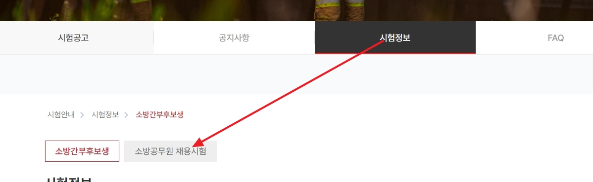 시험 정보 페이지로 들어오시면 '소방공무원 채용시험'과 '소방간부후보생'이 나뉘어 있어요. 우리가 일반적으로 준비하는 건 왼쪽의 채용시험이니까 헷갈리지 마시고 클릭해 주세요. 간부후보생은 과목이랑 전형 절차가 완전히 다르거든요.