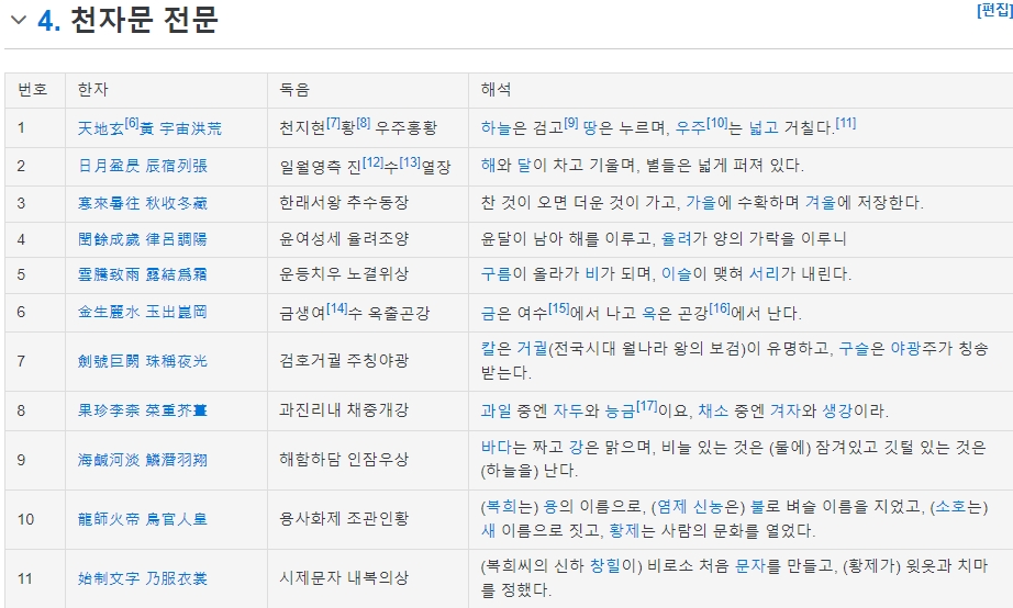 홈페이지에서 천자문을 검색하고 스크롤을 내리면, 천자문의 전문을 볼 수 있습니다. 여기에는 각 한자의 독음과 기본적인 해석이 포함되어 있어 학습에 바로 활용할 수 있으나, 한자 한 개 한 개에 대한 상세한 설명은 포함되어 있지 않습니다. 종이에 인쇄하여 볼 필요 없이 웹에서 직접 보는 것이 현대적인 학습 방식에 더 부합할 수 있습니다.