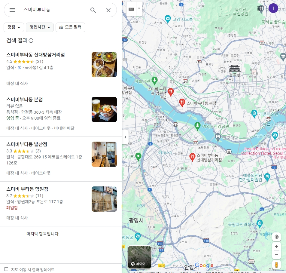 PC나 스마트폰에서 지도를 켜시면 상단에 빈칸이 하나 보이실 겁니다. 이 곳에 찾고 싶은 구글 지도 검색 방법을 활용하여 장소명이나 주소를 입력해 주시면 됩니다. 굳이 정확한 명칭이 아니더라도 연관된 단어를 넣으면 찰떡같이 찾아주니 너무 걱정하지 않으셔도 괜찮습니다.