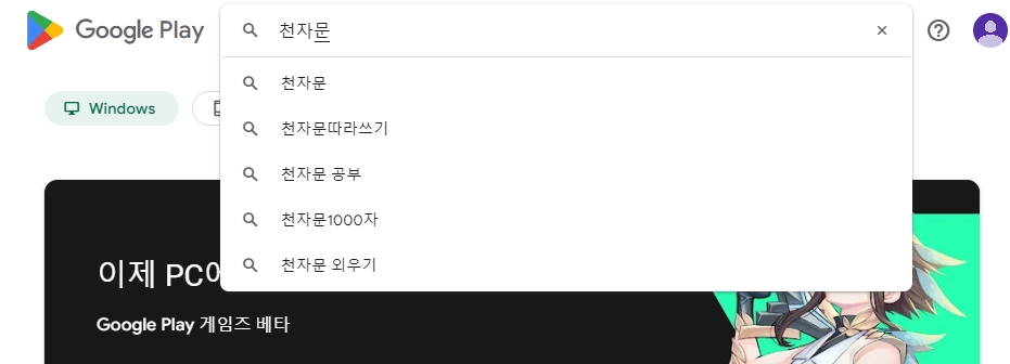 플레이스토어의 검색창에 있는 돋보기 아이콘을 클릭하고 천자문이라고 입력하여 검색함으로써 관련 어플을 찾아볼 수 있습니다.