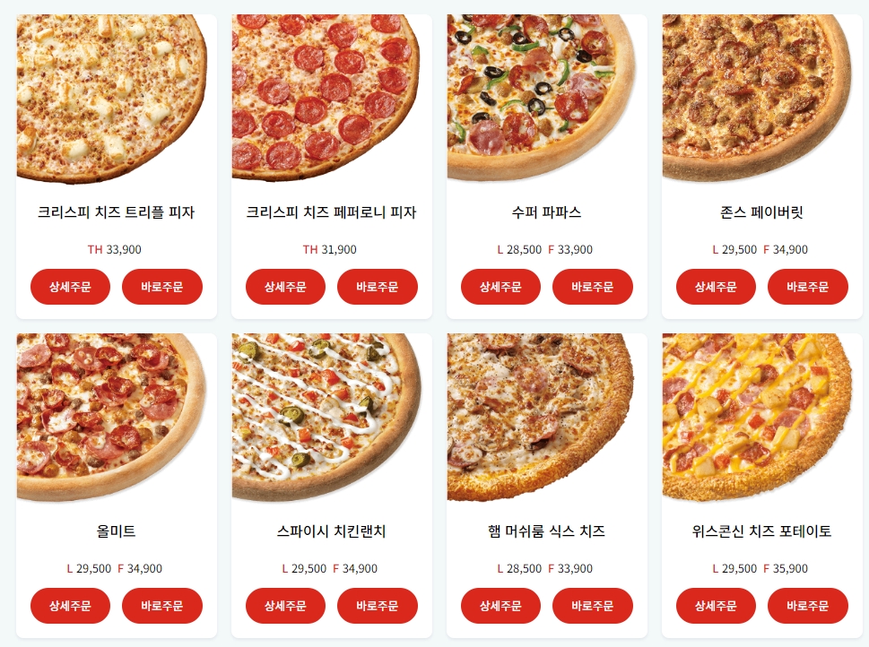 마가리타, 페퍼로니, 하와이안, 가든 스페셜, 스파이시 이탈리안, 슈림프 알프레도 등도 있어 취향에 맞게 선택할 수 있습니다.