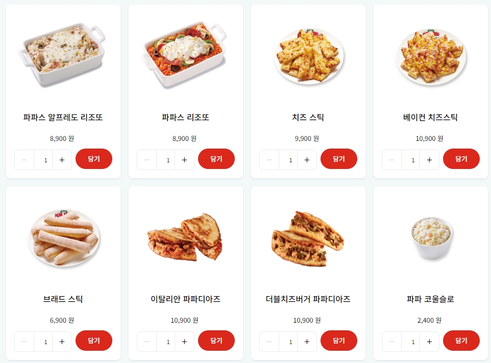 파파스 알프레도 리조또, 파파스 리조또, 치즈 스틱, 베이컨 치즈스틱, 브래드스틱, 이탈리안 파파디아즈, 더블치즈버거 파파디아즈, 파파코울슬로, 콘샐러드 등도 메뉴에 포함되어 있습니다.