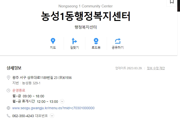 상세 정보를 통해 해당 주민센터가 월요일부터 금요일까지 오전 9시부터 오후 6시까지 운영하며, 점심 휴게시간이 오후 12시부터 1시까지라는 것을 알 수 있습니다.
