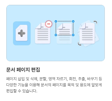 문서 페이지 편집 기능을 통해 페이지 삽입 및 삭제, 분할, 영역 자르기, 회전, 추출, 바꾸기 등을 이용해 문서 페이지를 목적 및 용도에 맞게 편집할 수 있습니다.