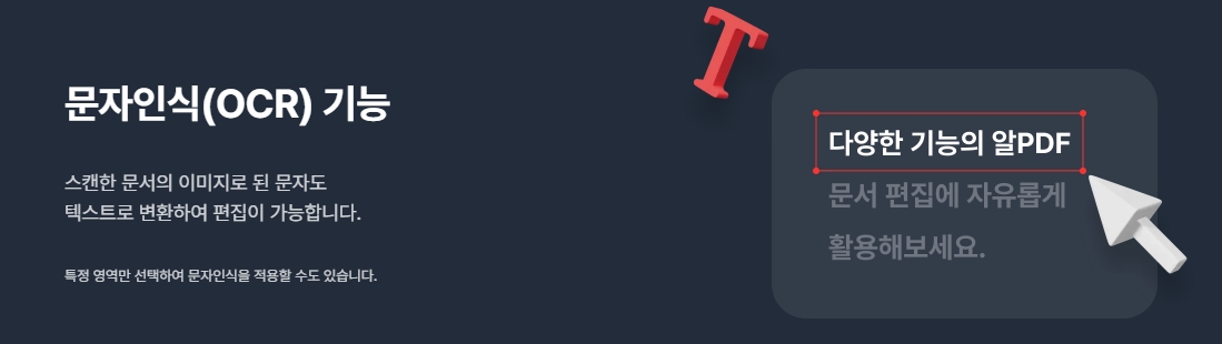 문자인식(OCR) 기능을 통해 스캔한 문서 이미지로 된 문자를 텍스트로 변환하여 편집할 수 있습니다. 특정 영역만을 선택하여 문자인식을 적용하는 것도 가능합니다.
