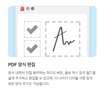 PDF 양식 편집 기능으로 문서 내에서 라디오 버튼, 콤보 박스 등의 필드를 쉽게 추가하고 편집할 수 있으며, 디지털 서명 등의 보안 양식 추가도 가능합니다.