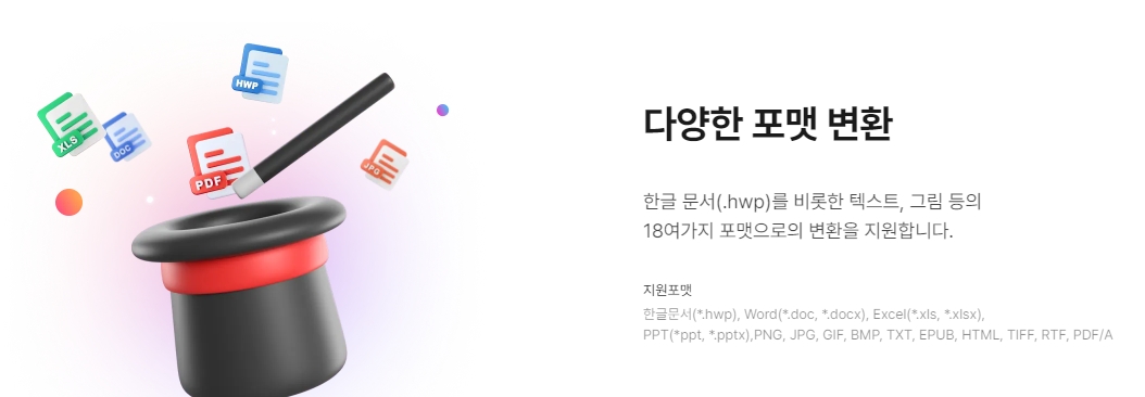 다양한 포맷 변환이 지원됩니다. 한글 문서(.hwp), Word(.doc, .docx), Excel(.xls, .xlsx), PPT(.ppt, .pptx), PNG, JPG, GIF, BMP, TXT, EPUB, HTML, TIFF, RTF, PDF/A 등 18여 가지 포맷으로의 변환이 가능합니다.