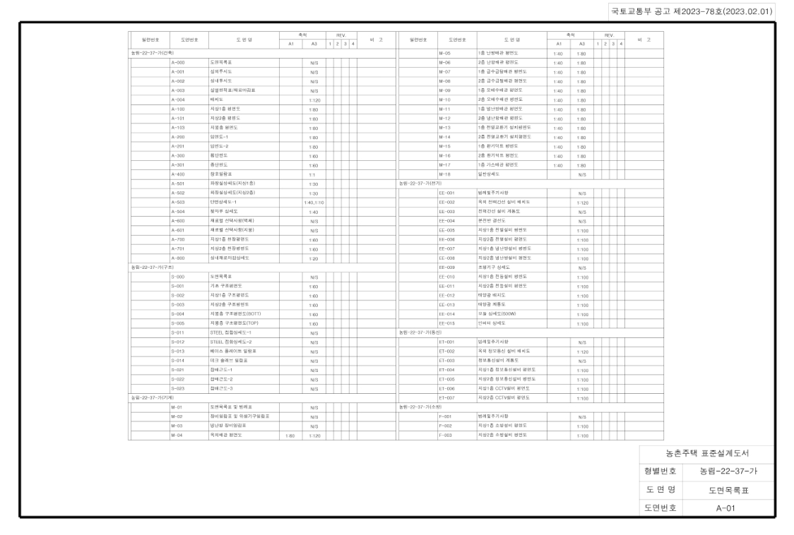 설계도 하단에는 주택 설계와 관련된 다양한 정보를 나타내는 표가 있으며, 여기서는 열람용, 인허가용, 3D 도면 등 다양한 유형의 도면을 구분하여 제공합니다. 이러한 정보는 주택 건축 과정에서 필요한 서류나 도면의 종류를 이해하는 데 도움이 됩니다.