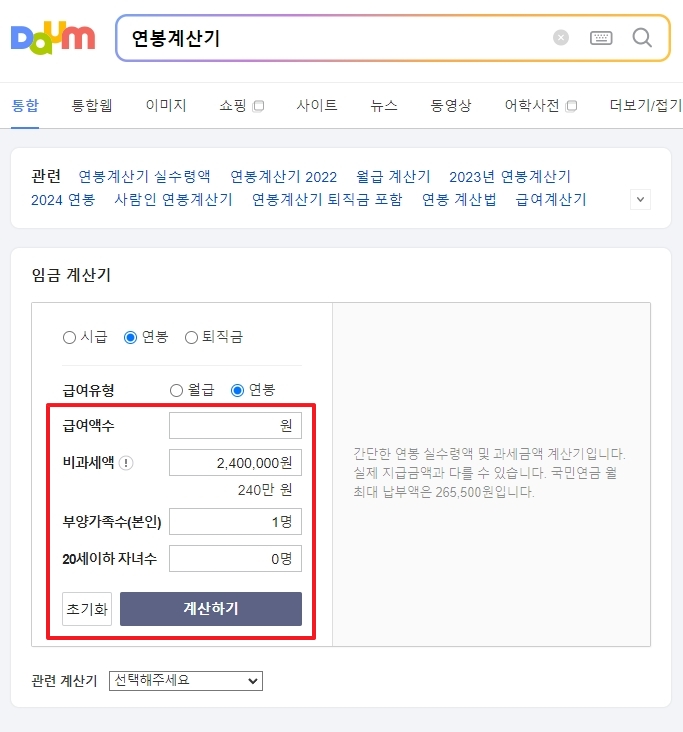 다음(Daum) 검색 엔진에서 연봉계산기를 검색하면, 다양한 임금 계산기 중에서 연봉 관련 계산기를 찾을 수 있습니다. 검색 결과에서 연봉 계산기를 선택하고, 급여 유형에서 연봉을 선택합니다. 이 단계는 연봉에 대한 정확한 계산을 위한 시작점입니다.