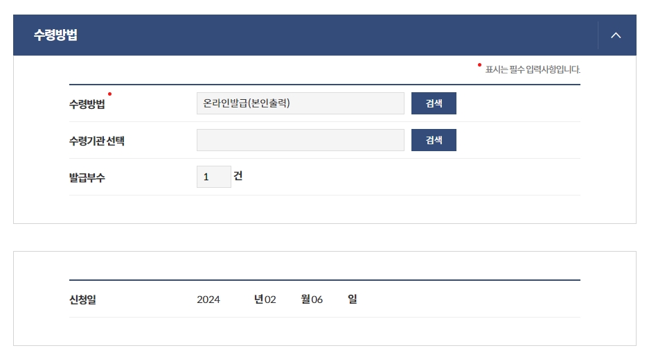 병적증명서의 수령 방법을 선택하고 원하는 발급 부수를 확인한 후 진행합니다.
